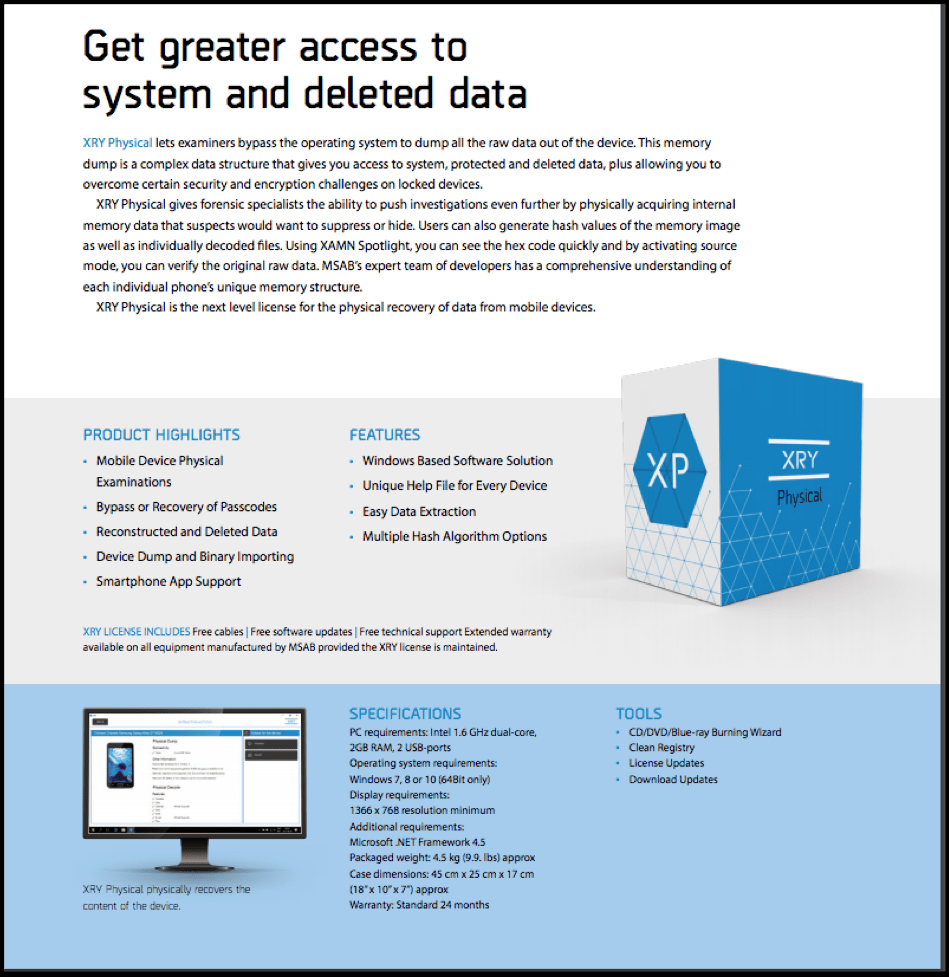 MSAB 声明其 XRY Physical 产品通过绕过操作系统访问所有系统和已删除的数据。它们可以克服(某些)锁定设备上的安全性和加密挑战。