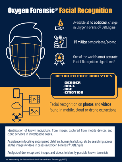 从2019年7月起,Oxygen Forensic Detective 内置的 Oxygen Forensic JetEngine 模块,利用自身技术对人脸进行分类。