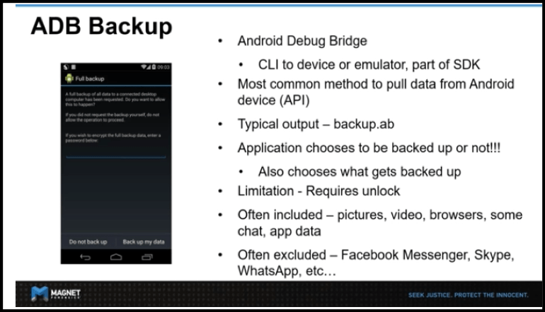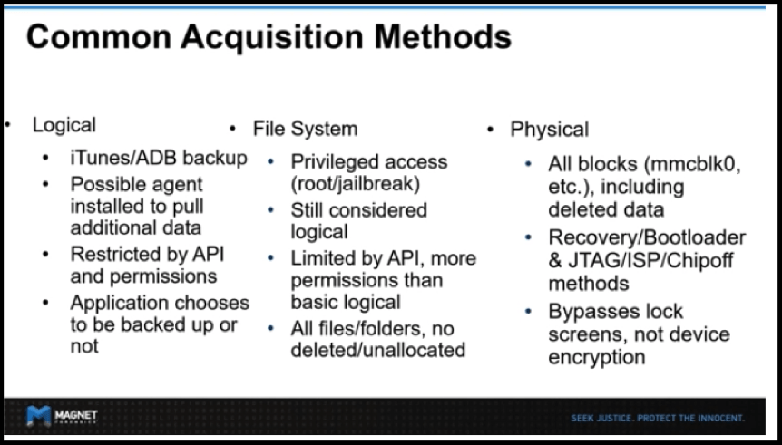 如 Magnet Forensics(下图)中的幻灯片所示,可以通过 iTunes / ADB 备份或安装代理来实现逻辑提取。使用特权访问(例如 root 或越狱)的文件系统;和物理使用恢复或引导加载程序的方法。