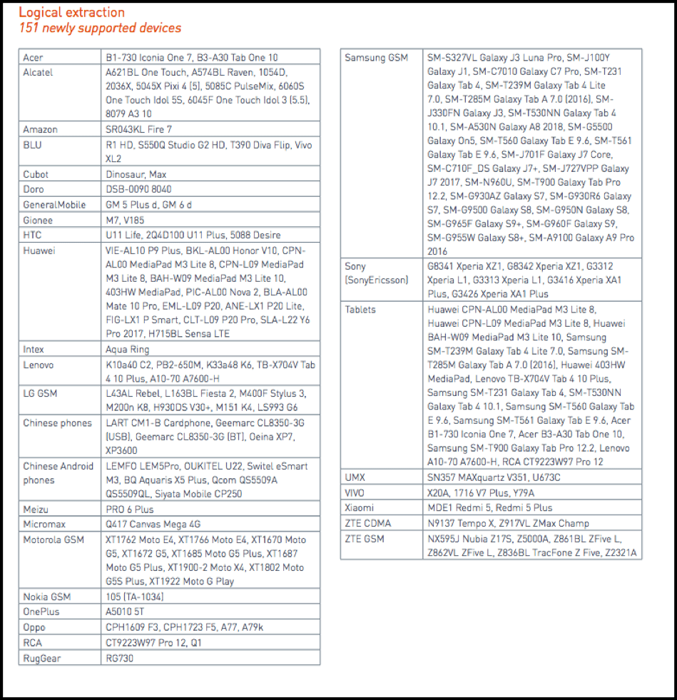 即使解锁,也不保证所有设备都可以进行逻辑提取。例如,Cellebrite 的产品更新列出了支持的手机: