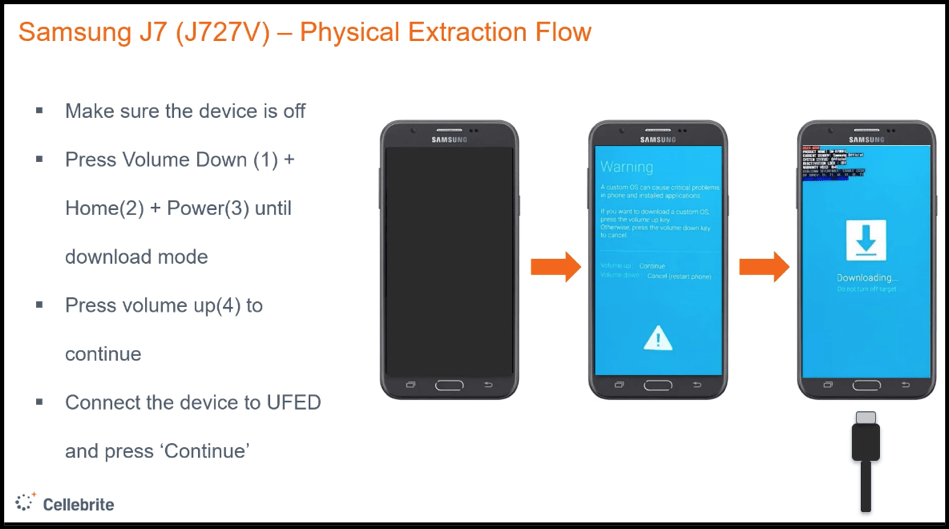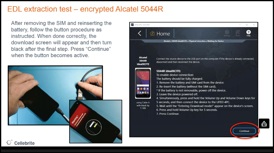 将设备置入EDL模式的方式因手机而异,从 Cellebrite 的UFED等各种可以支持的技术到需要取证技巧的侵入性技术,不一而足。如果 Cellebrite 支持 EDL,UFED 可以指导你做什么,比如说,按住VOL向上和向下。