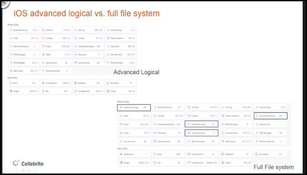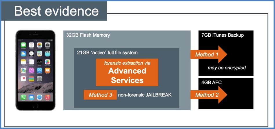 Cellebrite 声称使用其内部实验室 “Cellebrite Advanced Services” 提取了iOS设备的完整文件系统,可以从32GB闪存中获取21GB。