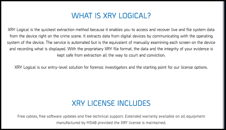 MSAB 自称为 “移动设备取证技术的先驱”,它将其 XRY Logical 推销为 “我们为法证研究人员提供的入门级解决方案,以及我们许可证选项的起点”。