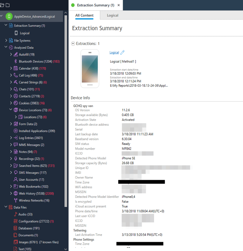 Magnet Forensics 报告称,他们随后可以获取第三方应用程序数据,而不止 iTunes 备份、Apple Mail数据、Web缓存和应用程序缓存、操作系统数据、位置数据、钥匙串数据、和一些已删除的消息等方面: