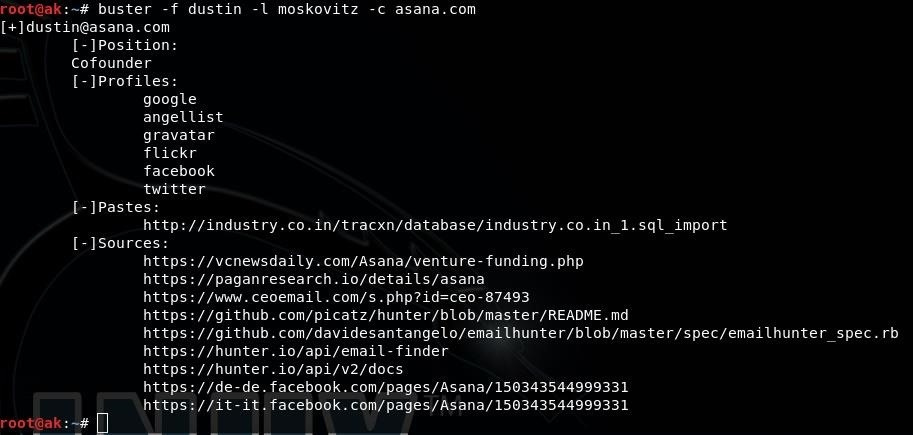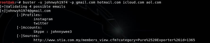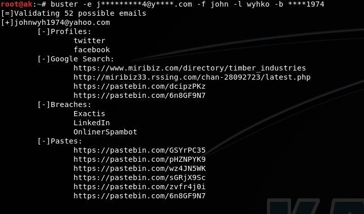 Buster 将获取您所知道的有关目标人的信息,并将生成所有可能的组合,然后将其与您提供的模式进行比较(例如:k **** s@gmail.com)并列出所有可能的电子邮件地址,然后遍历每封电子邮件,并使用不同的方法检查是否实际存在(smtp 检查,社交媒体筛查等等 …)