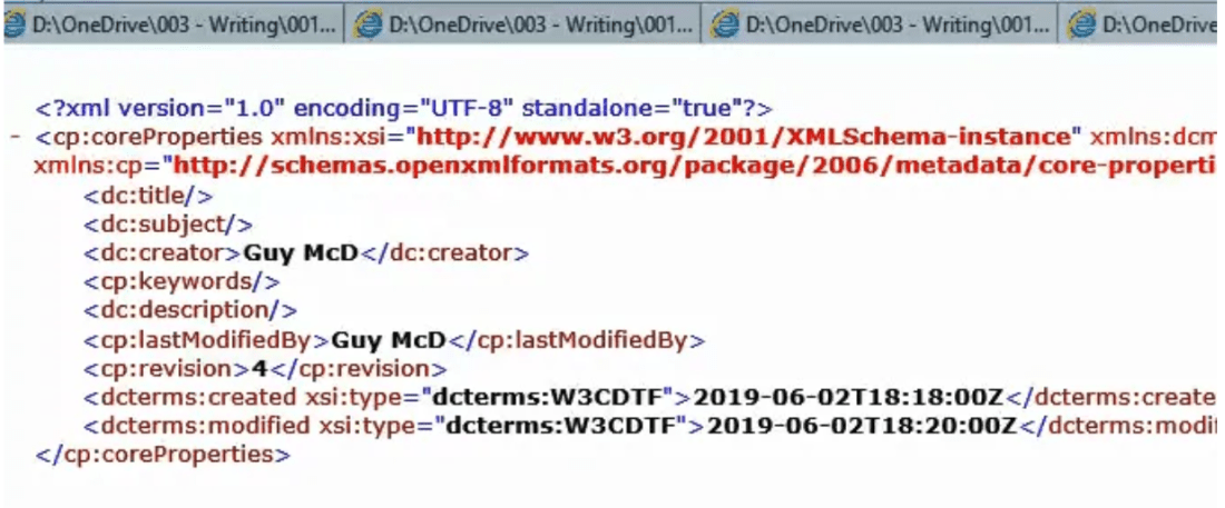 看起来可能有点奇怪,但是您应该能够弄清楚大多数信息的含义。有两个XML文件可能包含您的名字:docProps 文件夹中的 core.xml 以及 word 文件夹中的 document.xml 和 people.xml。