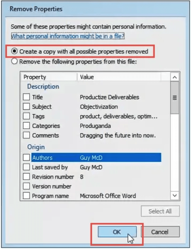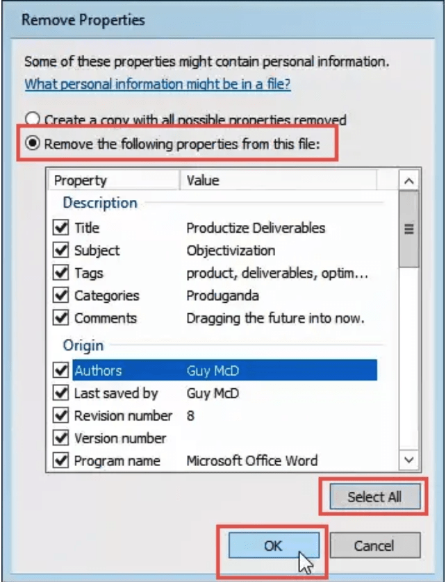方法1:选择“从此文件中删除以下属性:” 然后仅选中所需的框,或单击 “全选” 按钮。然后单击确定。