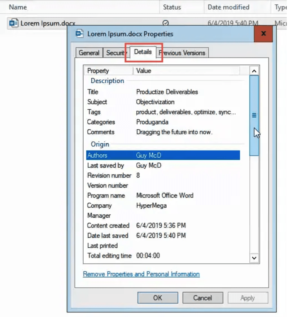 在 “属性” 窗口中,单击 “详细信息” 选项卡。您会在简洁明了的列表中看到所有元数据。