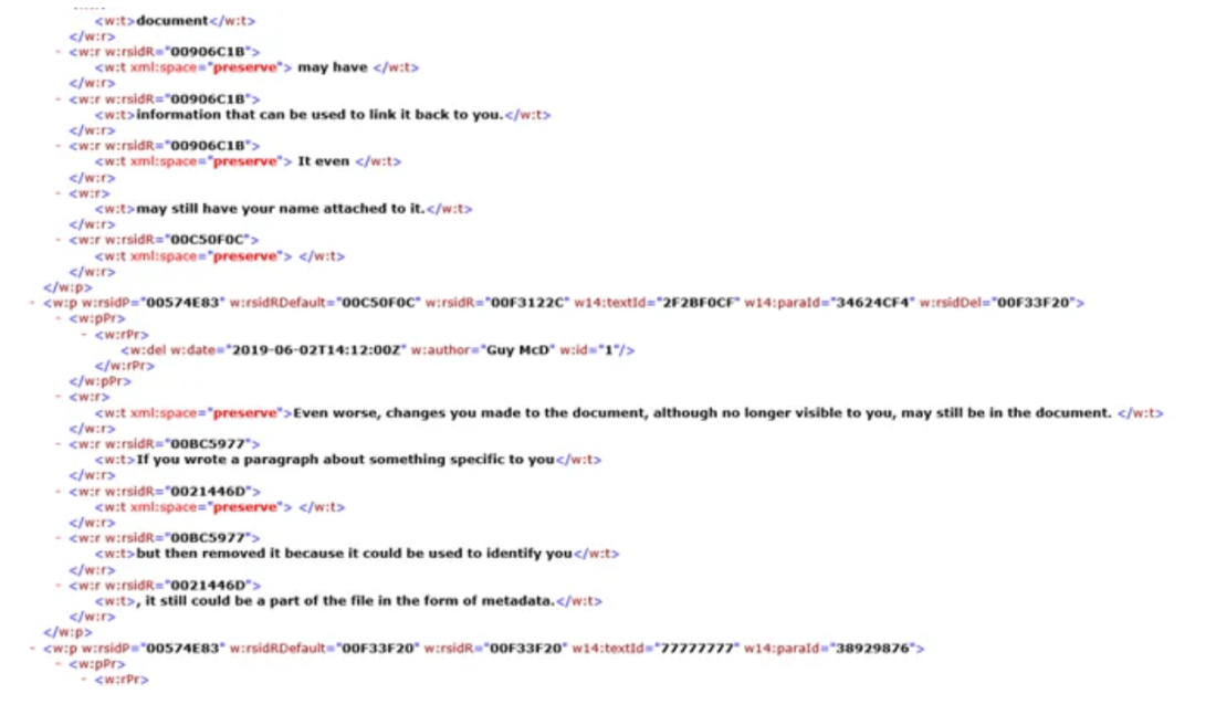 如果您写了一段包含特定内容的段落,但由于这一段路可以用来识别您的身份于是您将其删除了,那么它仍可能以元数据的形式成为文件的一部分。