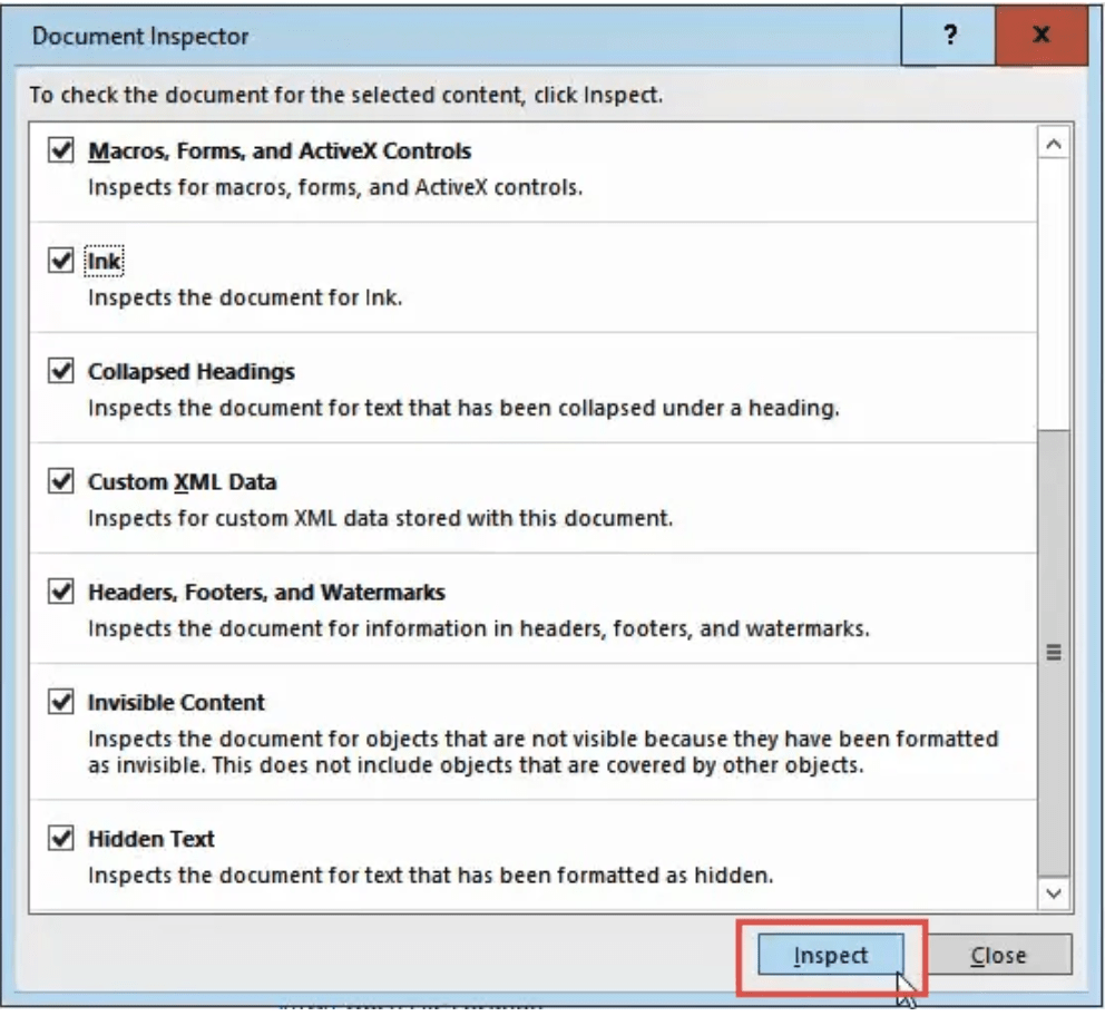 确保选中文档检查器中的所有复选框,然后单击 “检查” 按钮。