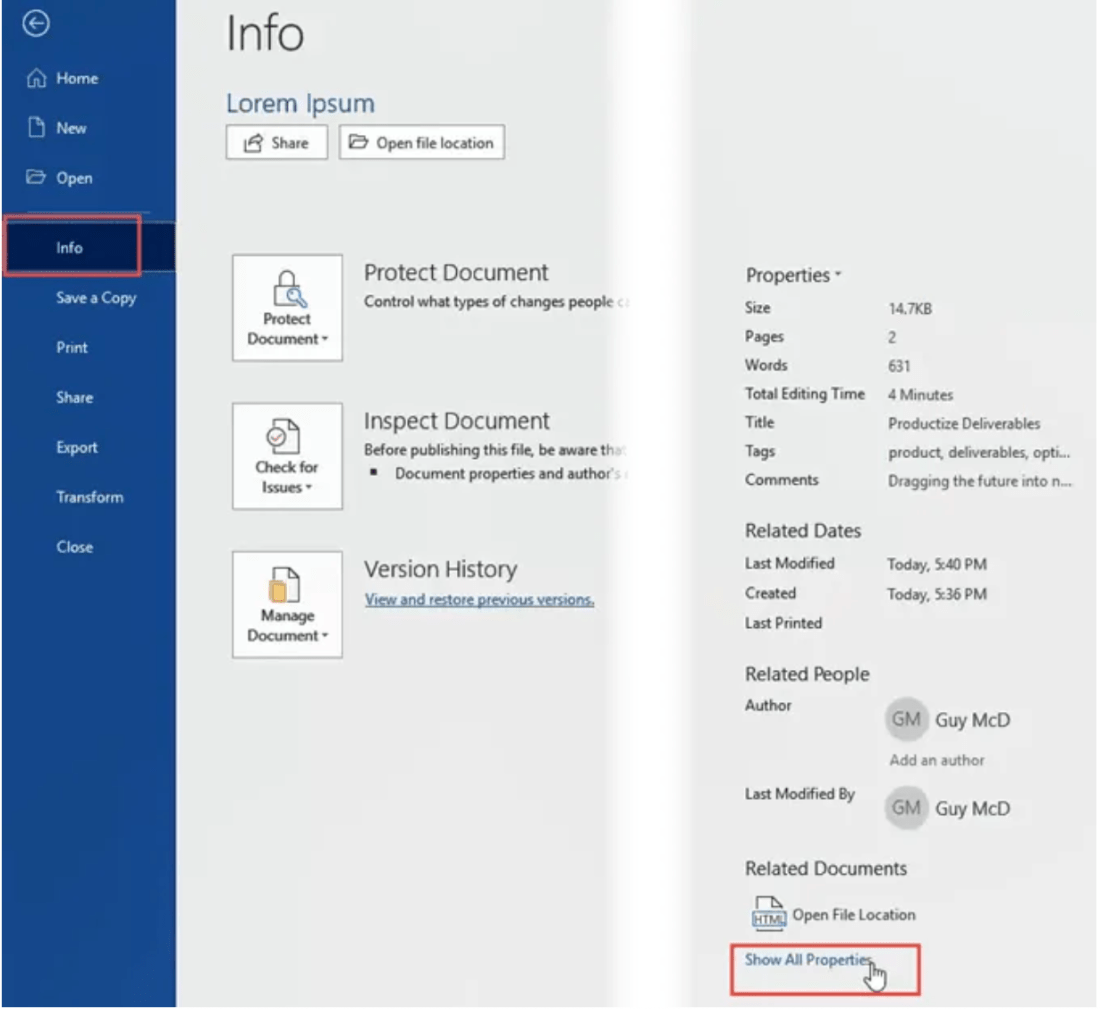 在 “Info” 屏幕上,您会看到很多信息,例如大小、页面、单词数、总编辑时间、最后修改时间、创建时间和相关人员、以及其他数据。