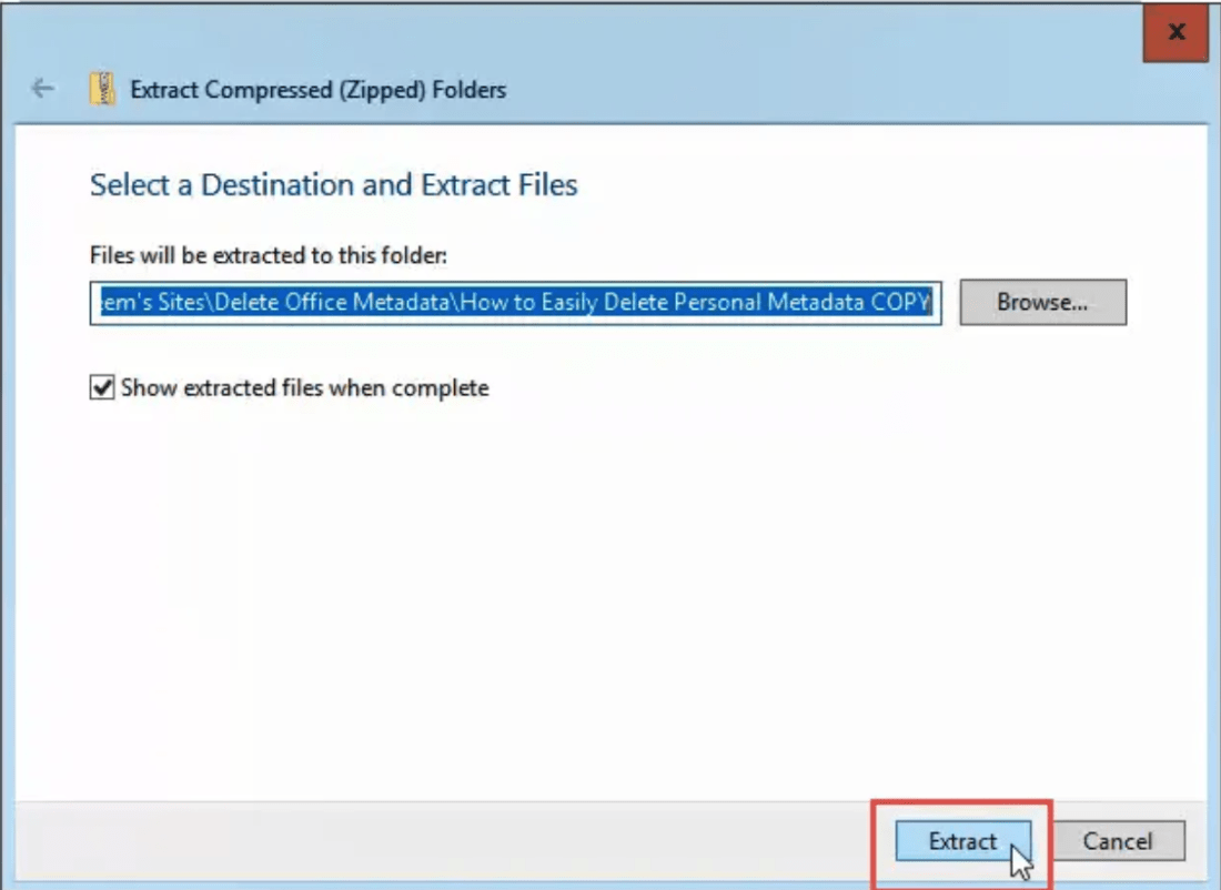 在打开的窗口中,它将询问您要将提取的文件保存在何处,以及是否要在完成后显示提取的文件。选默认就可以。单击提取。