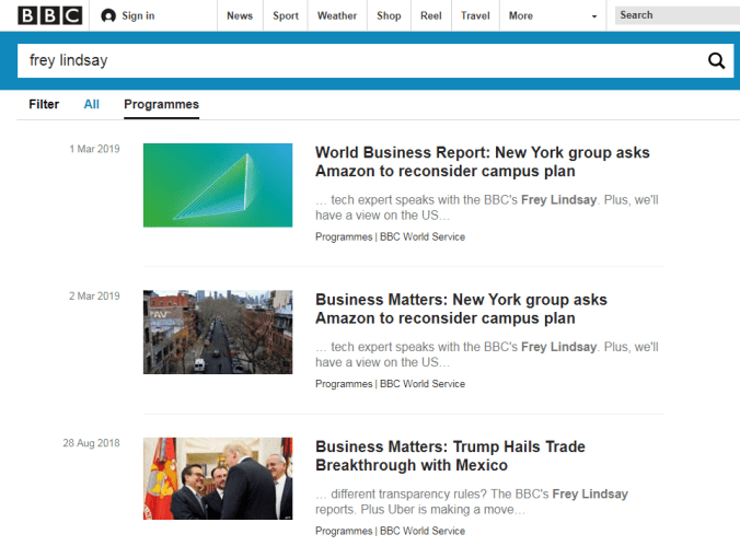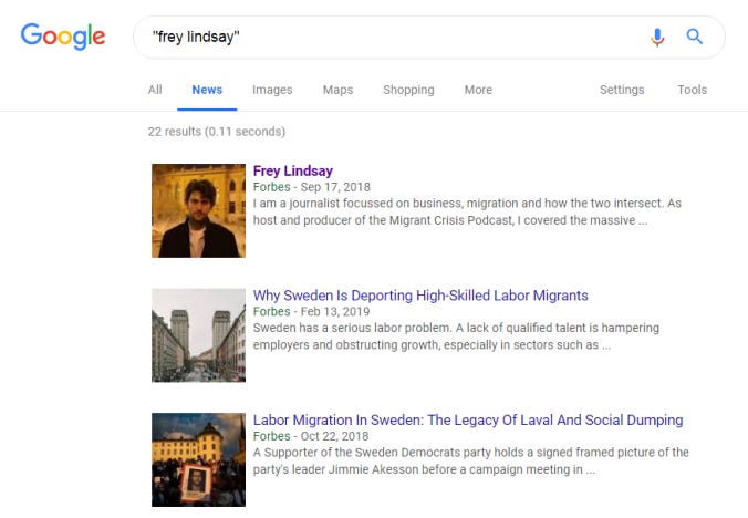可以用同样的方式搜索一位最近联络我的 BBC 记者。这是谷歌新闻的搜索结果,首先是一些他为福布斯撰写的文章:在谷歌新闻搜索 Frey Lindsay 时,出现了许多他为福布斯撰写的文章。