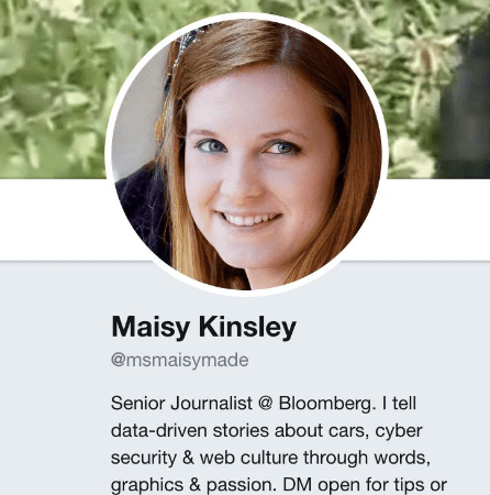 首先来看看推特上的个人简介和头像。这个叫 Maisy 的人使用的头像是一张原创的照片,如果对它进行反向图片搜索,并不会找到其它关于 Maisy 的照片,也不会出现别人的名字,所以这不太可能是盗用的头像。而在个人介绍中,Maisy 自称为彭博的撰稿人。