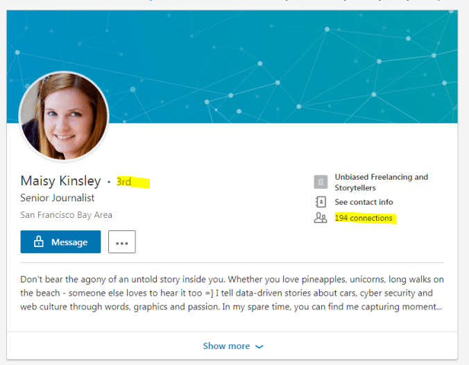 Maisy 的网站上显示她是一名 “自由撰稿人”。但就像她在推特上的信息一样,这些都是她自己说的。不过我们由此找到了她的领英页面,显示 Maisy 有194位联络人,她甚至是我的三度联络人!(我已经有点看烦她的照片了,但让我们再坚持一会。)