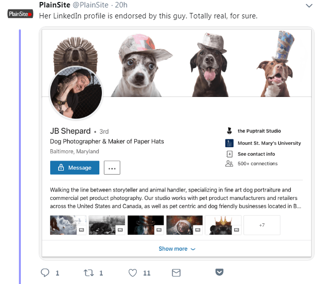 讲个好玩的事吧,一群推特用户参与调查了 Maisy 假扮记者事件,也检视了她在领英上的联系人及那些所谓的人脉关系。其中有一位 “牧羊人先生” 似乎一看就是个骗子。他还自称是宠物摄影师和纸制帽子匠人。