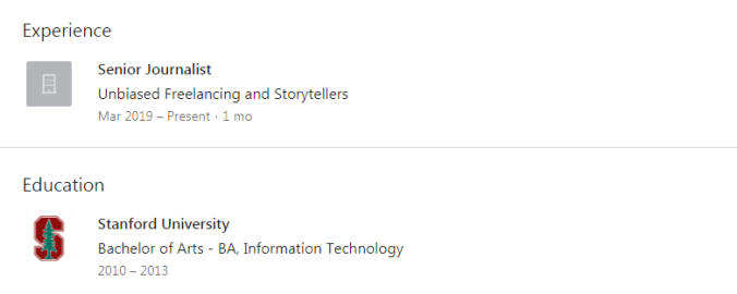 首先,领英页面上的教育信息一点也不比推特更权威。虽然它看起来很官方,但是,其实你想写什么就写什么。你看,我就刚刚让自己上了斯坦福,而且读的是超酷的天体物理学。