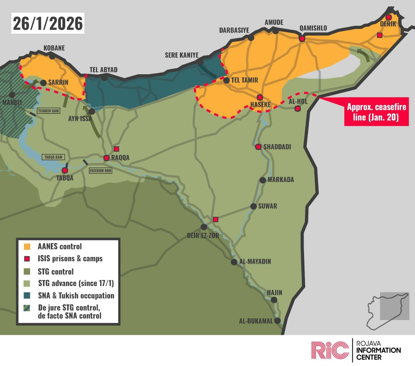 三天后,叙利亚政府全面进攻罗贾瓦地区。1月18日,叙利亚总统艾哈迈德·沙拉宣布与SDF达成停火协议,但交火随即重启。罗贾瓦面临全面灭绝战争的威胁,包括土耳其军队可能再度入侵。1月20日,SDF同意停火条款,规定该地区将归属大马士革叙利亚政府管辖,SDF将并入叙利亚军队。昨日该停火协议获得延期;但截至目前,罗贾瓦部分地区仍处于围困状态。