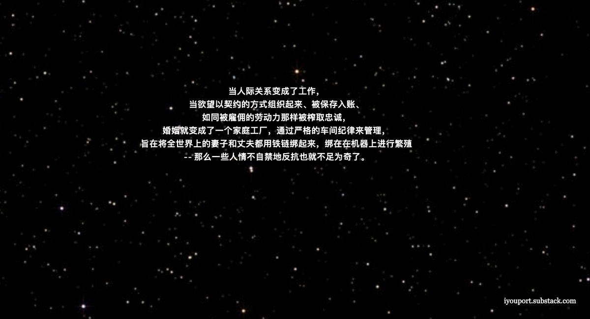 当人际关系变成了工作,当欲望以契约的方式组织起来、被保存入账、如同被雇佣的劳动力那样被榨取忠诚,婚姻就变成了一个家庭工厂,通过严格的车间纪律来管理,旨在将全世界的妻子和丈夫都用铁链捆绑起来,绑在机器上进行繁殖 — — 那么其中一些人情不自禁地反抗也就不足为奇了。
