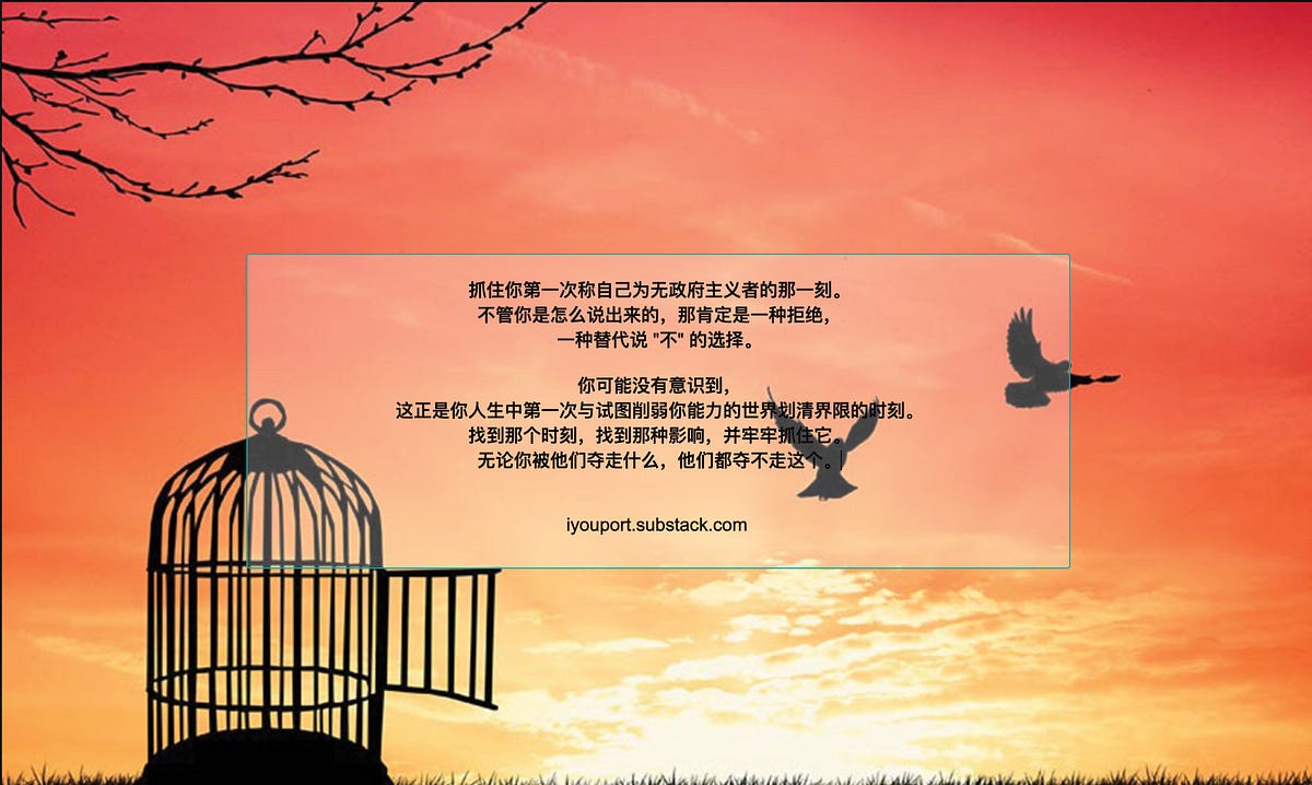 抓住你第一次称自己为无政府主义者的那一刻。不管你是怎么说出来的,那肯定是一种拒绝,一种替代说 “不” 的选择。你可能没有意识到,这正是你人生中第一次与试图削弱你能力的世界划清界限的时刻。找到那个时刻,找到那种影响,并牢牢抓住它。无论你被他们夺走什么,他们都夺不走这个。