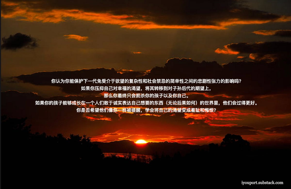 如果你压抑自己对幸福的渴望,将其转移到对子孙后代的期望上,那么你最终只会扼杀你的孩子以及你自己。