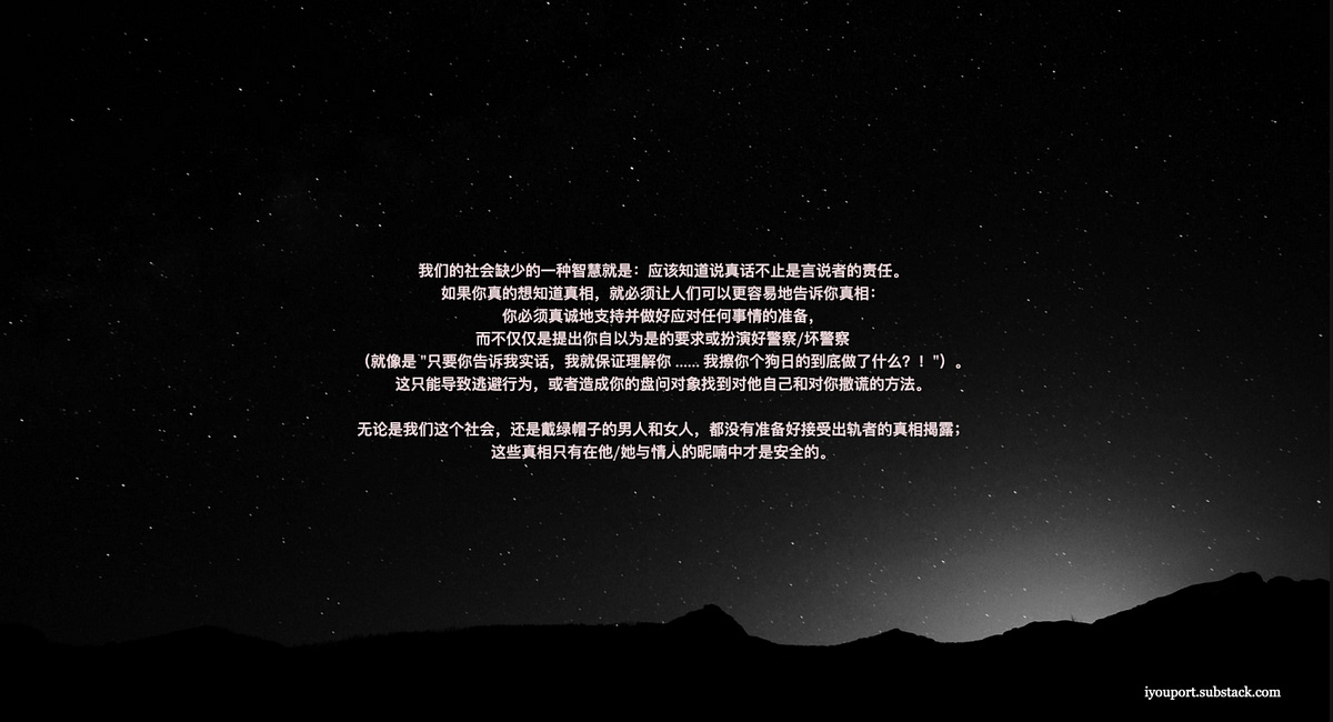 我们的社会缺少的一种智慧就是:应该知道说真话不止是言说者的责任。如果你真的想知道真相,就必须让人们可以更容易地告诉你真相:你必须真诚地支持并做好应对任何事情的准备,而不仅仅是提出你自以为是的要求或扮演好警察/坏警察( 就像是 “只要你告诉我实话,我就保证理解你 …… 我擦你个狗日的到底做了什么?!”)。这只能导致逃避行为,或者造成你的盘问对象找到对他自己和对你撒谎的方法。