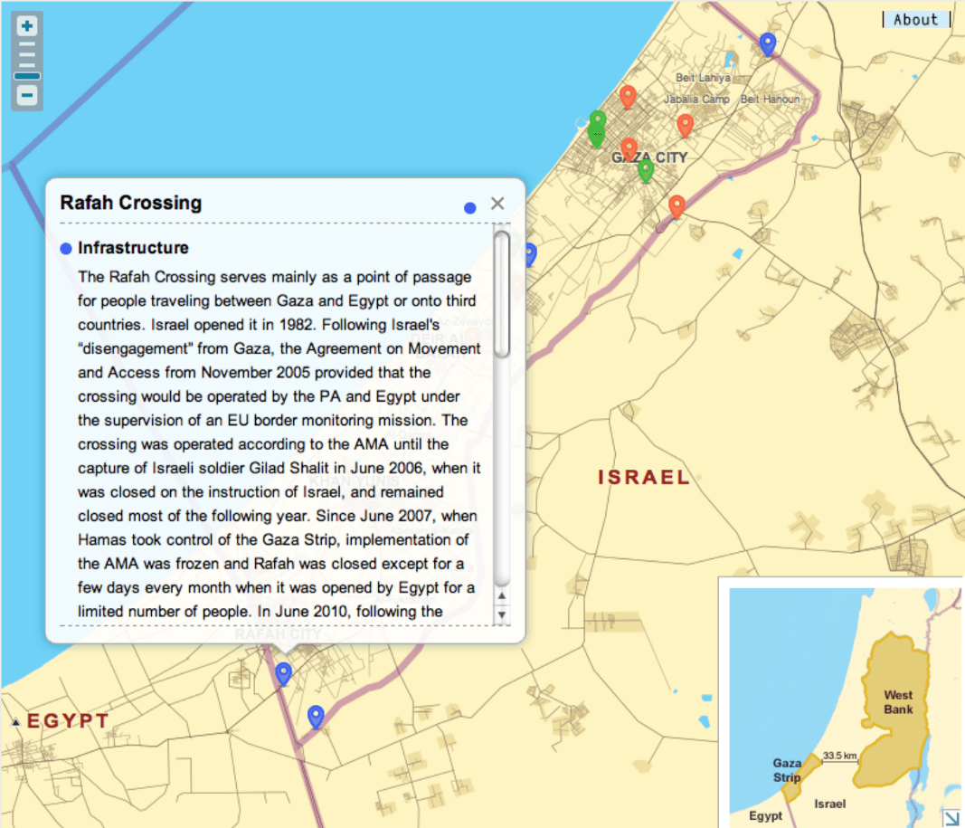 为了直观地反映170万加沙地带居民每天都在遭遇的问题,以色列的一个公民非政府组织 Gisha 创建了一个加沙虚拟之旅。通过包含文字、图像和视频的加沙地带互动地图,观众可以看到限制进入政策如何影响到当地的基础设施和教育以及经济。
