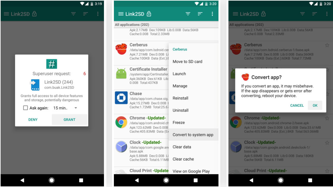 从这里,找到并长按 Cerberus 条目,然后从弹出窗口中选择“转换为系统应用程序”。