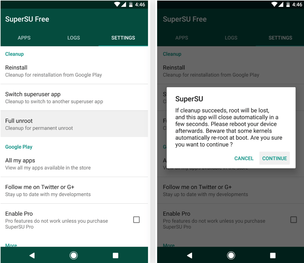 所以,建议打开你的 SuperSU 应用程序,前往 Settings 选项卡,然后点击“Full unroot”按钮。