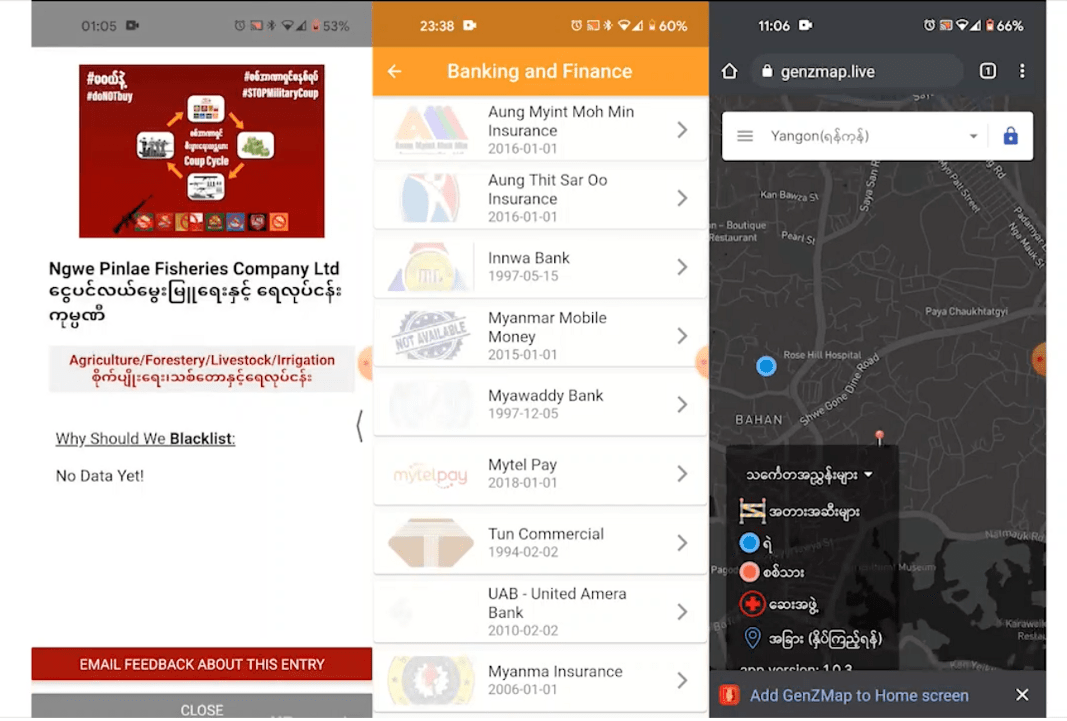 缅甸的数字活动家还创建了其他应用程序,以警告普通公民和抗议者在街头正在增加警察和军队的存在。2月11日在安卓系统上推出的 Genz Map Live 从用户那里获取实时的数据,以突出显示镇压部队高度集中的地区。这款已经拥有4万用户的应用还可以显示水炮、路障、和救护车的位置。所有的数据在上传之前都会经过版主的事实核查。