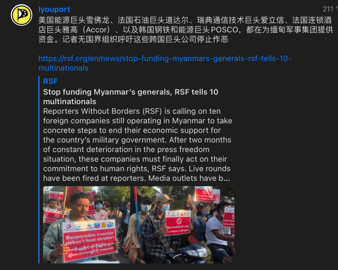 “如果人们不支持这些品牌或服务,那么我们的钱就不会进入军事政权。我们可以慢慢削减他们对国家的垄断性影响。”