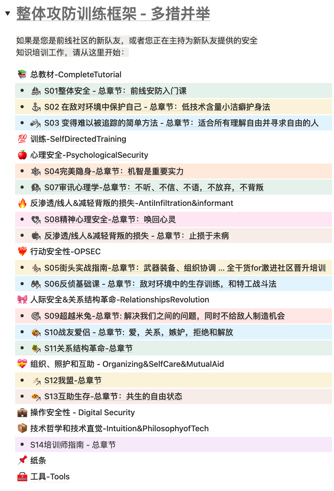 “整体攻防训练框架” —— 这一部分包含14套教程,适合前线社区的新队友,或者培训工作的组织者。如果您正在准备全面学习,我们推荐按序号推进。